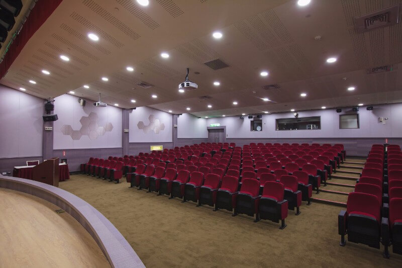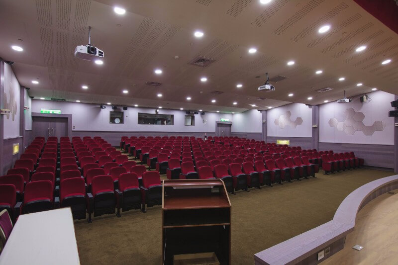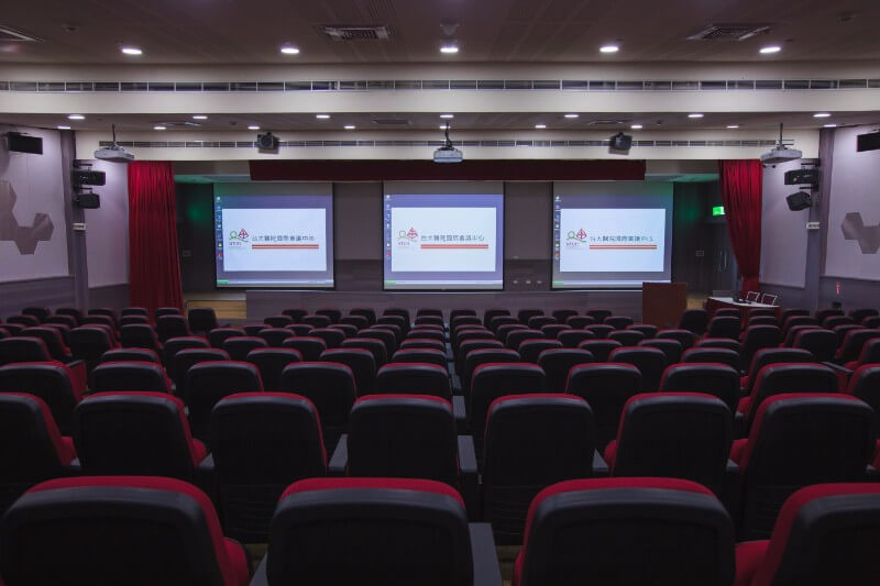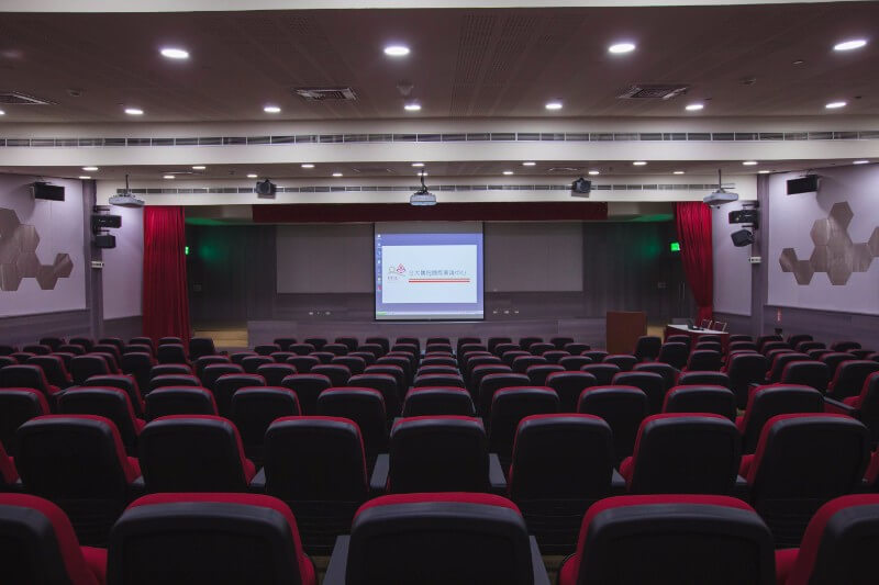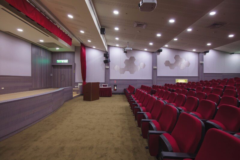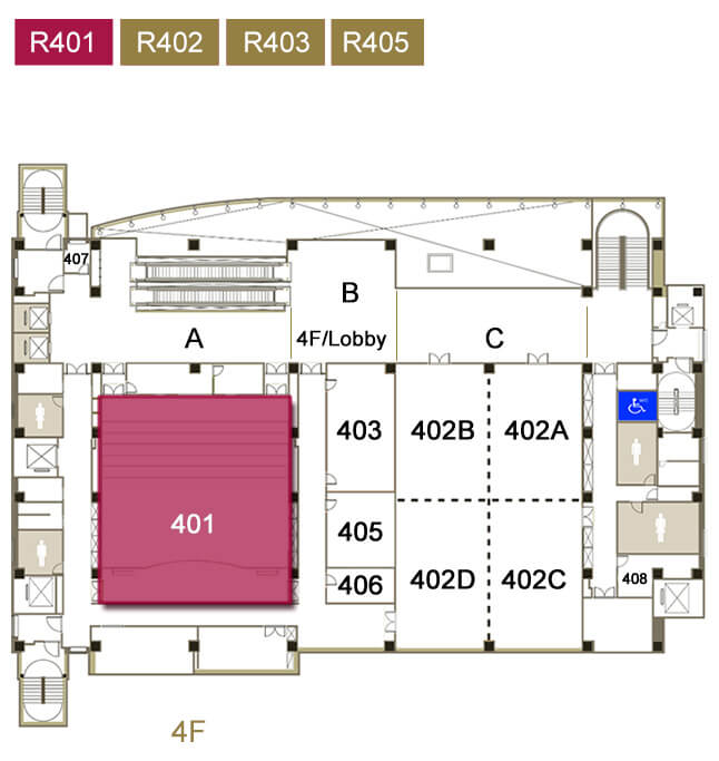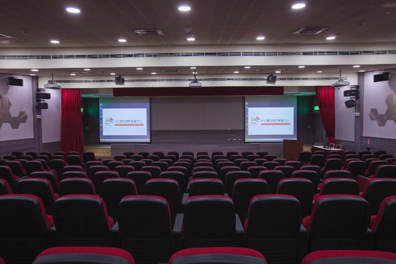 Room 401 features a built-in stage, permanent tiered seating with desk-seat design and can accommodate 220 in theater style. There are three sets of projection equipment on the stage. The projection screen for each is 180 inches.