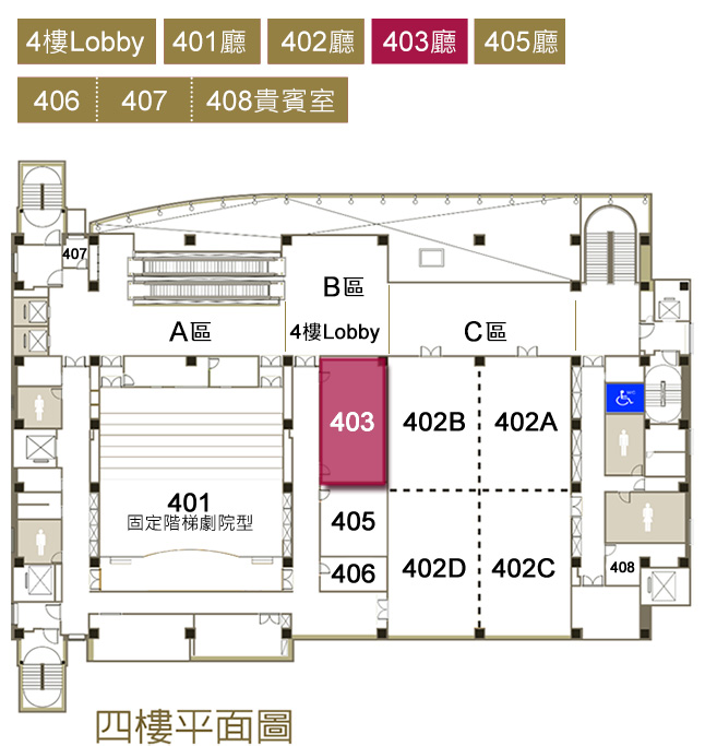 403廳19坪空間,可容納60人,適合小型研討會、員工教育訓練、公關活動及小型餐會等等。